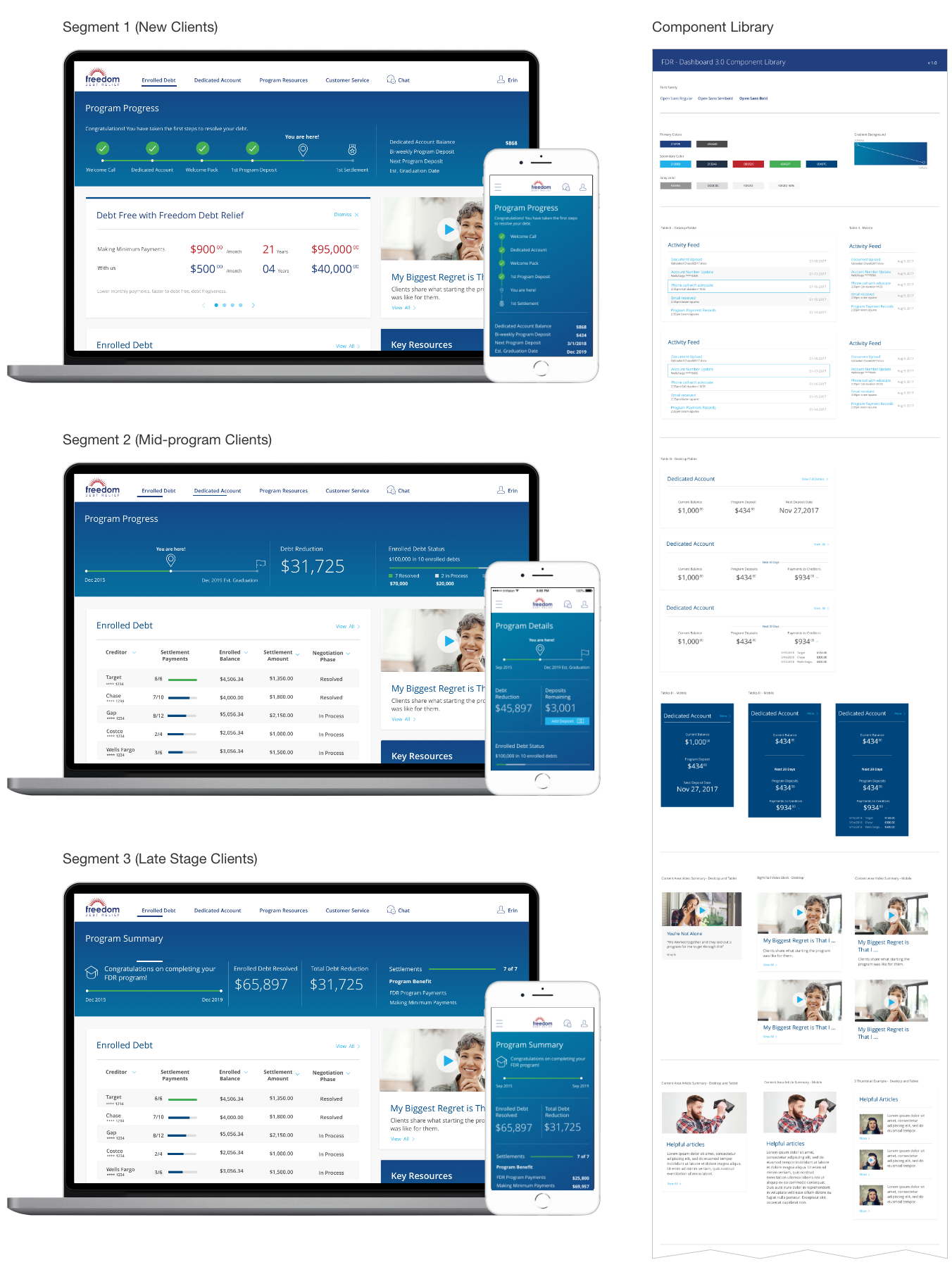 Note: Not shown in the mockups above are a slew of other features that added to the success of the Client Dashboard redesign, including: Draft modifications, enrolled debt details, FAQs, support content, message center, document vault, and more.